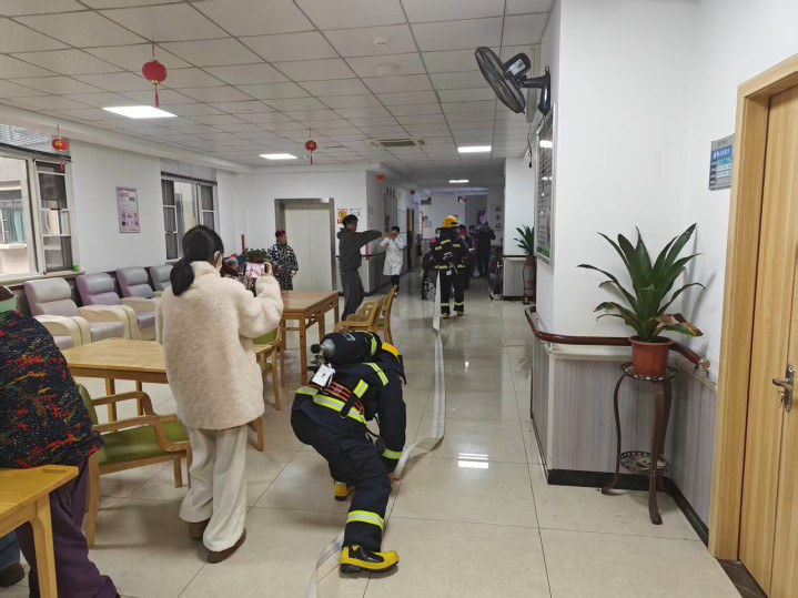 随着警报拉响,演练正式启动。护理员们迅速反应,有的安抚、引导老人撤离,有的推轮椅避障,有的取用灭火器。消防员则动作利落,连接水带、扛设备上楼,在狭窄楼梯间快速行进,直奔模拟起火点。