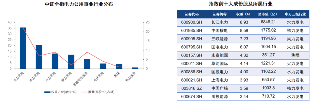 中证全指电力公用事业指数,全面覆盖火电、水电、核电、风电等细分及服务相关领域,助力捕捉传统电力保供与新能源转型领域投资机遇。从市值分布来看,指数成份股整体偏向大盘风格。截至2025年11月30日,成份股总市值在1000亿以上权重占比最高,为44.88%,数量共计9只;成份股总市值在500-1000亿的权重占比为14.78%,数量共计6只。中证全指电力公用事业指数前十大权重股包含长江电力、中国核电、三峡能源、国电电力、永泰能源等电力行业龙头,合计权重为54.21%。(不构成投资建议,历史不代表未来,市场有风险,投资需谨慎)
