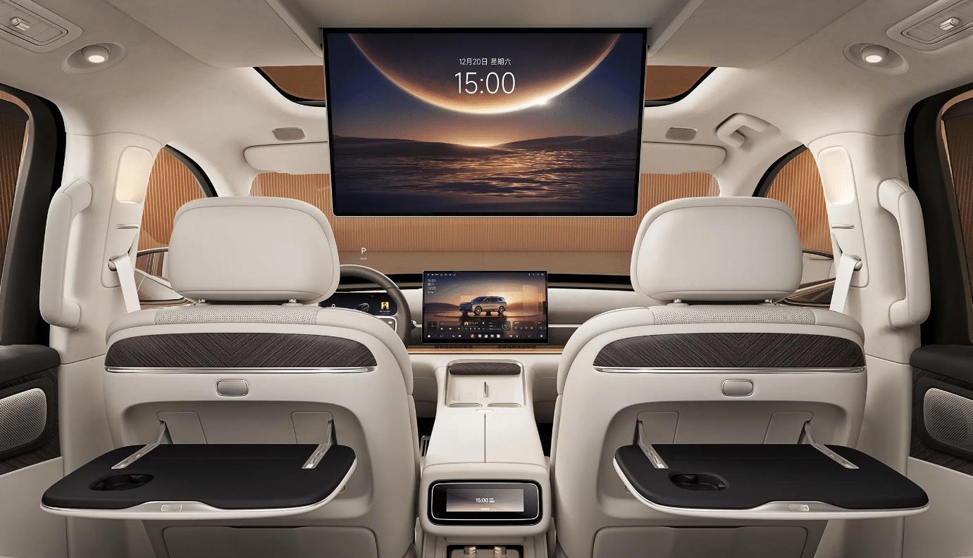 目前的官方定妆照主打了大6座的布局,也就是座椅采用2+2+2的模式,这样第2排两个大的独立座椅体验非常类似那些大尺寸mpv,当然细节上也有折叠小桌板,大容量的冰箱,以及车顶的折叠大电视。